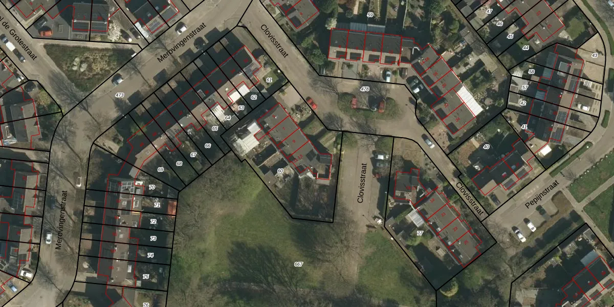 Het perceel waarop Clovisstraat 13 staat heeft een oppervlakte van 1045 m². Dit is een zeer groot perceel. De perceeloppervlakte wordt geregistreerd door het Kadaster. Gedetailleerde informatie over de maten van dit perceel kunt u vinden in het rapport Kadastrale kaart met maatvoering van Clovisstraat 13.