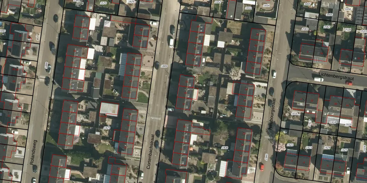 Het perceel waarop Cortenbachstraat 19 staat heeft een oppervlakte van 7423 m². Dit is een zeer groot perceel. De perceeloppervlakte wordt geregistreerd door het Kadaster. Gedetailleerde informatie over de maten van dit perceel kunt u vinden in het rapport Kadastrale kaart met maatvoering van Cortenbachstraat 19.