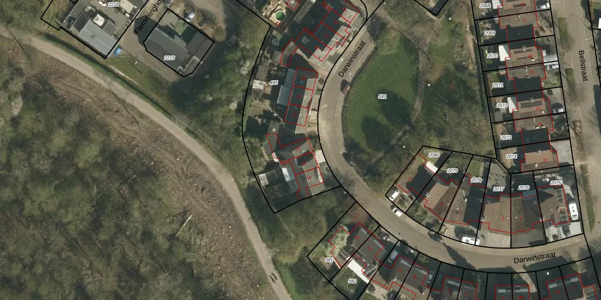 Het perceel waarop Darwinstraat 22 staat heeft een oppervlakte van 2565 m². Dit is een zeer groot perceel. De perceeloppervlakte wordt geregistreerd door het Kadaster. Gedetailleerde informatie over de maten van dit perceel kunt u vinden in het rapport Kadastrale kaart met maatvoering van Darwinstraat 22.