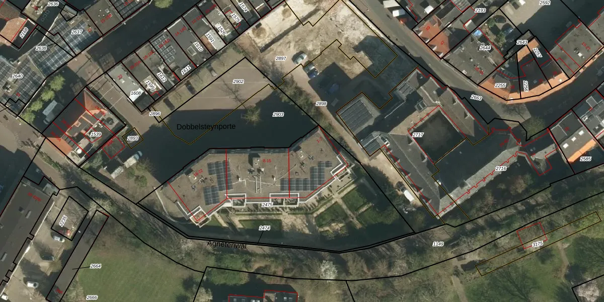 Het perceel waarop Dobbelsteynporte 2 staat heeft een oppervlakte van 2268 m². Dit is een zeer groot perceel. De perceeloppervlakte wordt geregistreerd door het Kadaster. Gedetailleerde informatie over de maten van dit perceel kunt u vinden in het rapport Kadastrale kaart met maatvoering van Dobbelsteynporte 2.