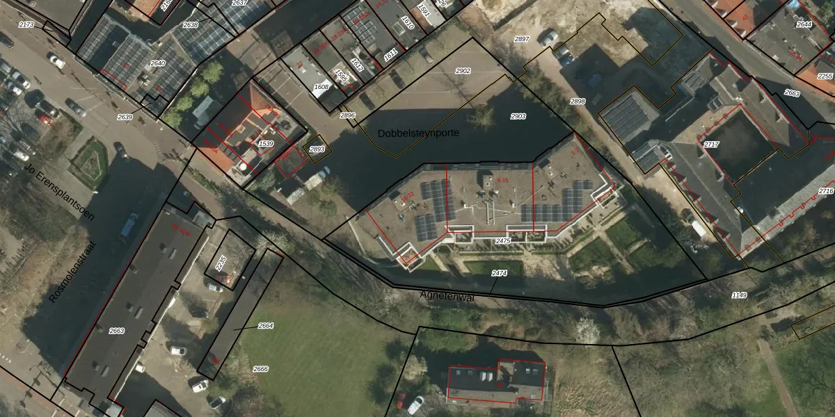 Het perceel waarop Dobbelsteynporte 20 staat heeft een oppervlakte van 2268 m². Dit is een zeer groot perceel. De perceeloppervlakte wordt geregistreerd door het Kadaster. Gedetailleerde informatie over de maten van dit perceel kunt u vinden in het rapport Kadastrale kaart met maatvoering van Dobbelsteynporte 20.