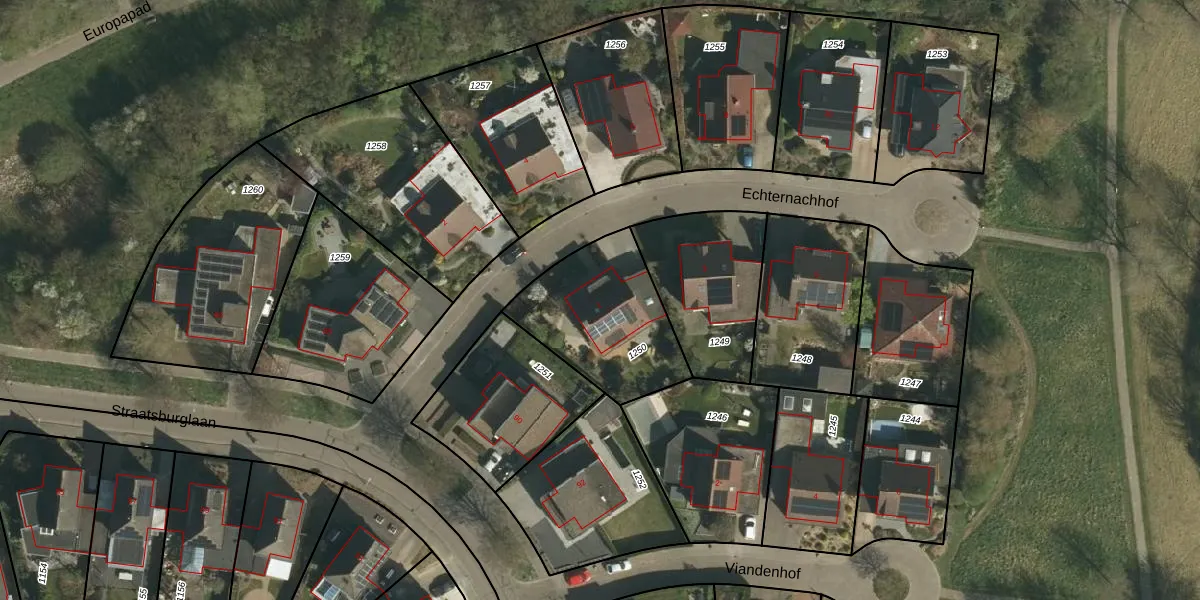 Echternachhof 1 is gelegen op kadastraal perceel STD00S1250. Deze kadastrale aanduiding is uniek en wordt gebruikt door het Kadaster om eigendomsrechten en andere zakelijke rechten vast te leggen. Het perceel maakt onderdeel uit van de kadastrale gemeente Sittard.