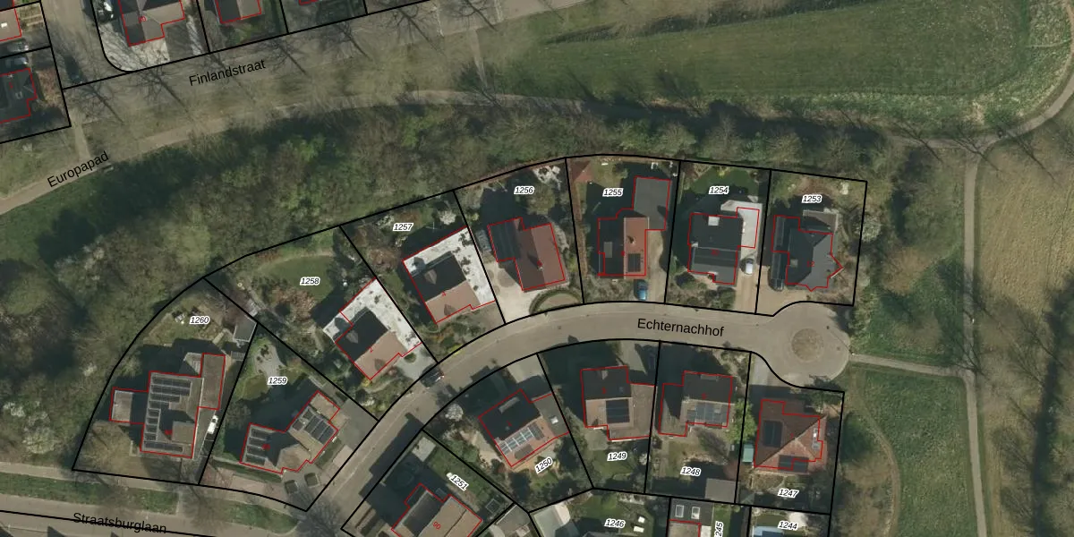Het perceel waarop Echternachhof 6 staat heeft een oppervlakte van 495 m². Dit is een groot perceel. De perceeloppervlakte wordt geregistreerd door het Kadaster. Gedetailleerde informatie over de maten van dit perceel kunt u vinden in het rapport Kadastrale kaart met maatvoering van Echternachhof 6.