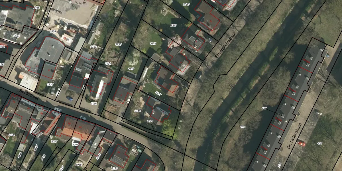 Het perceel waarop Ehrensteinstraat 4 staat heeft een oppervlakte van 530 m². Dit is een groot perceel. De perceeloppervlakte wordt geregistreerd door het Kadaster. Gedetailleerde informatie over de maten van dit perceel kunt u vinden in het rapport Kadastrale kaart met maatvoering van Ehrensteinstraat 4.