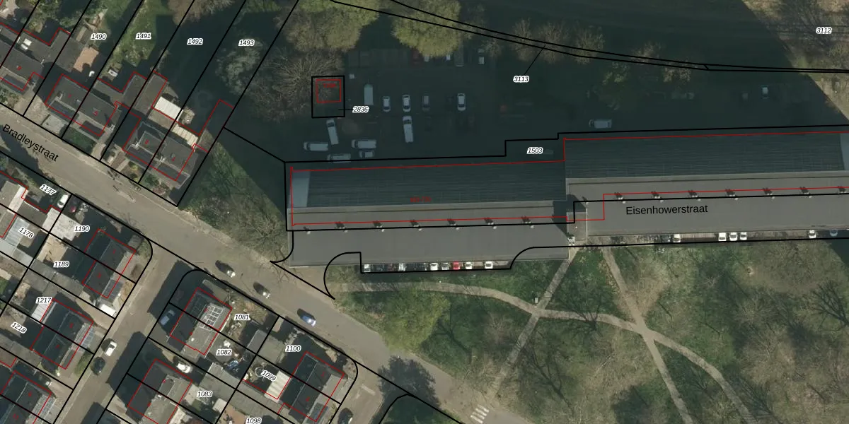 Het perceel waarop Eisenhowerstraat 605 staat heeft een oppervlakte van 2274 m². Dit is een zeer groot perceel. De perceeloppervlakte wordt geregistreerd door het Kadaster. Gedetailleerde informatie over de maten van dit perceel kunt u vinden in het rapport Kadastrale kaart met maatvoering van Eisenhowerstraat 605.