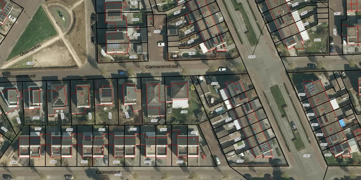 Het perceel waarop Germanenstraat 2 staat heeft een oppervlakte van 515 m². Dit is een groot perceel. De perceeloppervlakte wordt geregistreerd door het Kadaster. Gedetailleerde informatie over de maten van dit perceel kunt u vinden in het rapport Kadastrale kaart met maatvoering van Germanenstraat 2.