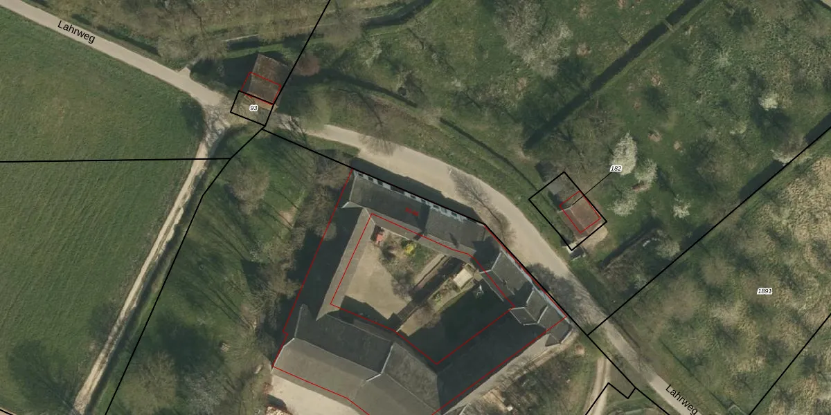 Het perceel waarop Lahrstraat 93 staat heeft een oppervlakte van 9070 m². Dit is een zeer groot perceel. De perceeloppervlakte wordt geregistreerd door het Kadaster. Gedetailleerde informatie over de maten van dit perceel kunt u vinden in het rapport Kadastrale kaart met maatvoering van Lahrstraat 93.