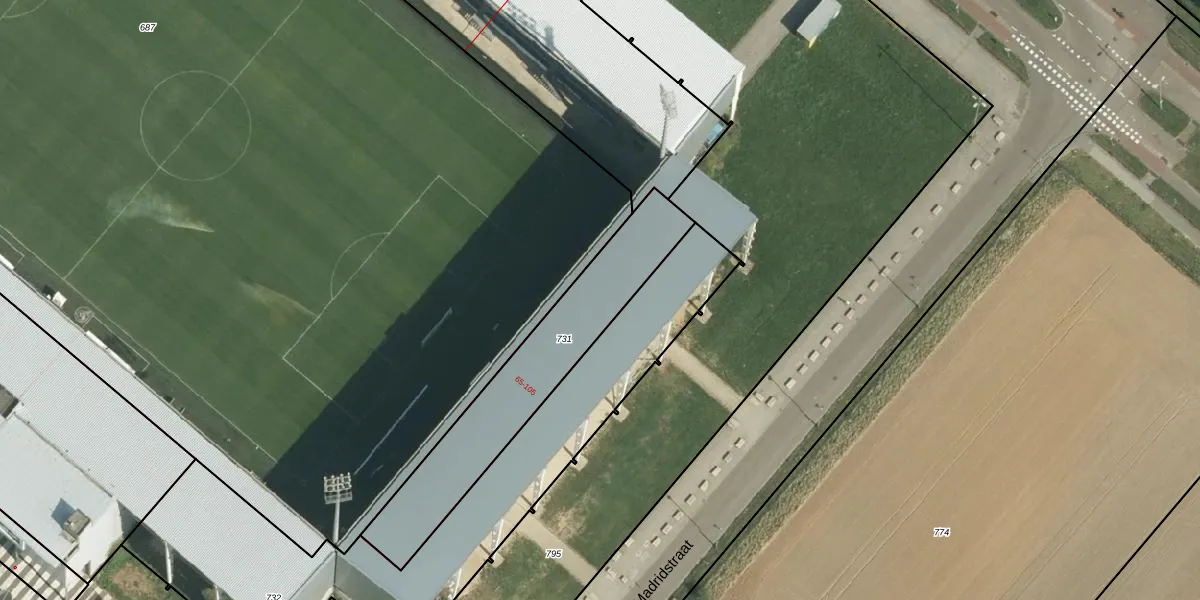 Het perceel waarop Madridstraat 65 staat heeft een oppervlakte van 685 m². Dit is een groot perceel. De perceeloppervlakte wordt geregistreerd door het Kadaster. Gedetailleerde informatie over de maten van dit perceel kunt u vinden in het rapport Kadastrale kaart met maatvoering van Madridstraat 65.