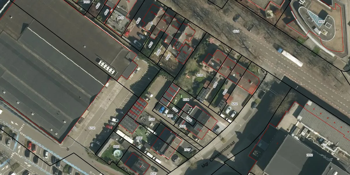 Het perceel waarop Mgr. Claessensstraat 1-G4 staat heeft een oppervlakte van 395 m². Dit is een groot perceel. De perceeloppervlakte wordt geregistreerd door het Kadaster. Gedetailleerde informatie over de maten van dit perceel kunt u vinden in het rapport Kadastrale kaart met maatvoering van Mgr. Claessensstraat 1-G4.