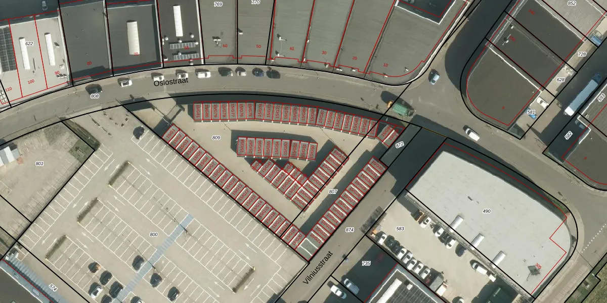 Het perceel waarop Oslostraat 15-G51 staat heeft een oppervlakte van 2087 m². Dit is een zeer groot perceel. De perceeloppervlakte wordt geregistreerd door het Kadaster. Gedetailleerde informatie over de maten van dit perceel kunt u vinden in het rapport Kadastrale kaart met maatvoering van Oslostraat 15-G51.