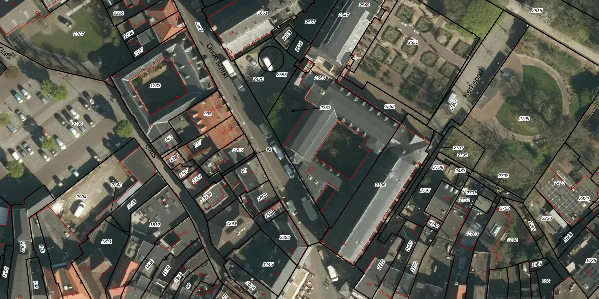 Het perceel waarop Oude Markt 1-A-2 staat heeft een oppervlakte van 1909 m². Dit is een zeer groot perceel. De perceeloppervlakte wordt geregistreerd door het Kadaster. Gedetailleerde informatie over de maten van dit perceel kunt u vinden in het rapport Kadastrale kaart met maatvoering van Oude Markt 1-A-2.