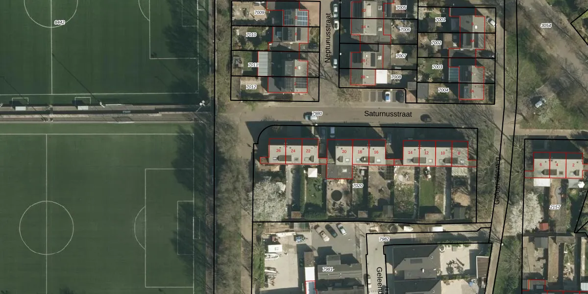 Het perceel waarop Saturnusstraat 24 staat heeft een oppervlakte van 2460 m². Dit is een zeer groot perceel. De perceeloppervlakte wordt geregistreerd door het Kadaster. Gedetailleerde informatie over de maten van dit perceel kunt u vinden in het rapport Kadastrale kaart met maatvoering van Saturnusstraat 24.
