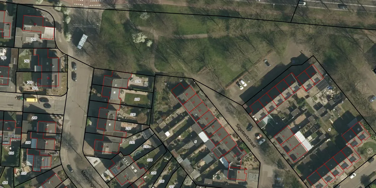 Het perceel waarop Sigebertstraat 26 staat heeft een oppervlakte van 2180 m². Dit is een zeer groot perceel. De perceeloppervlakte wordt geregistreerd door het Kadaster. Gedetailleerde informatie over de maten van dit perceel kunt u vinden in het rapport Kadastrale kaart met maatvoering van Sigebertstraat 26.