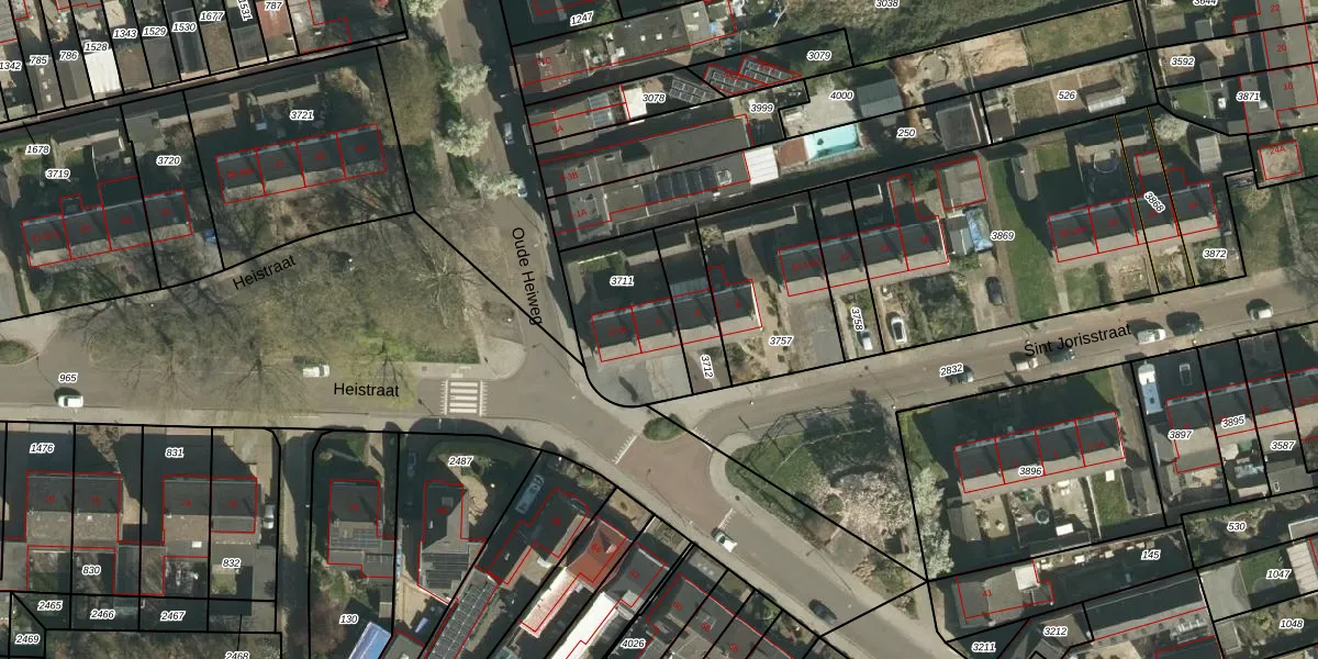 Het perceel waarop Sint Jorisstraat 4 staat heeft een oppervlakte van 376 m². Dit is een groot perceel. De perceeloppervlakte wordt geregistreerd door het Kadaster. Gedetailleerde informatie over de maten van dit perceel kunt u vinden in het rapport Kadastrale kaart met maatvoering van Sint Jorisstraat 4.