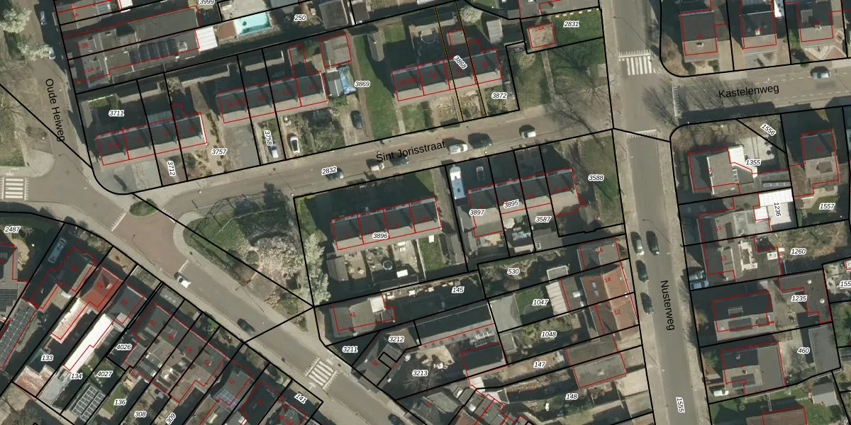 Het perceel waarop Sint Jorisstraat 7 staat heeft een oppervlakte van 963 m². Dit is een groot perceel. De perceeloppervlakte wordt geregistreerd door het Kadaster. Gedetailleerde informatie over de maten van dit perceel kunt u vinden in het rapport Kadastrale kaart met maatvoering van Sint Jorisstraat 7.