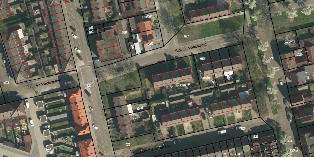 Het perceel waarop Sint Servaasstraat 1 staat heeft een oppervlakte van 3534 m². Dit is een zeer groot perceel. De perceeloppervlakte wordt geregistreerd door het Kadaster. Gedetailleerde informatie over de maten van dit perceel kunt u vinden in het rapport Kadastrale kaart met maatvoering van Sint Servaasstraat 1.