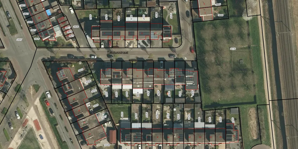 Tacitusstraat 9 is gelegen op kadastraal perceel STD00K3247. Deze kadastrale aanduiding is uniek en wordt gebruikt door het Kadaster om eigendomsrechten en andere zakelijke rechten vast te leggen. Het perceel maakt onderdeel uit van de kadastrale gemeente Sittard.