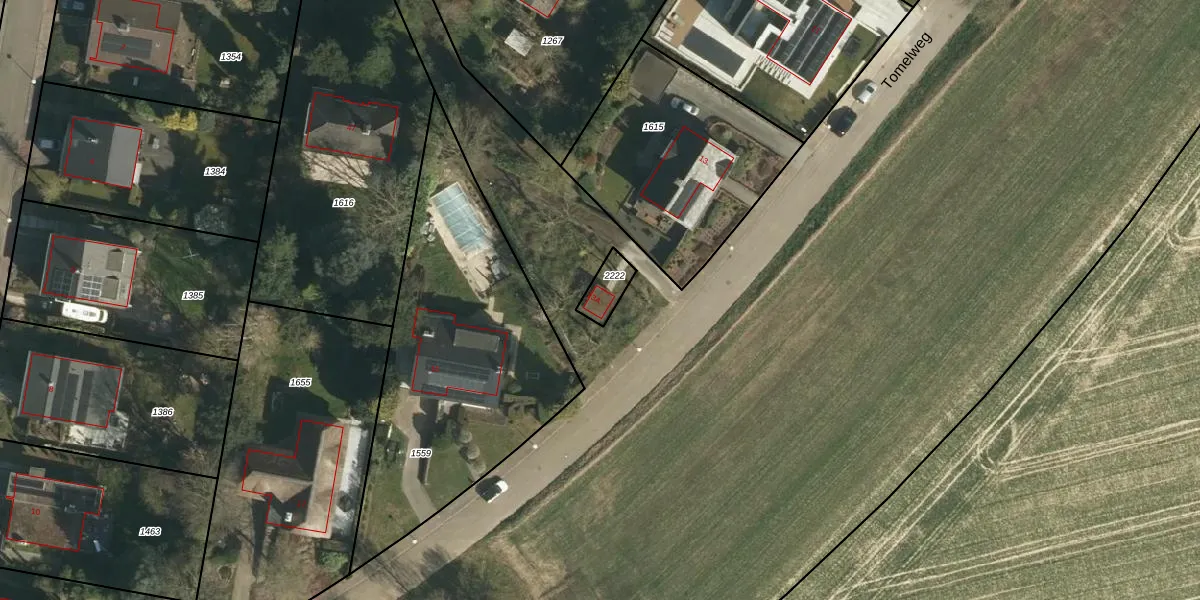 Tomelweg 13-A is gelegen op kadastraal perceel STD00G2222. Deze kadastrale aanduiding is uniek en wordt gebruikt door het Kadaster om eigendomsrechten en andere zakelijke rechten vast te leggen. Het perceel maakt onderdeel uit van de kadastrale gemeente Sittard.