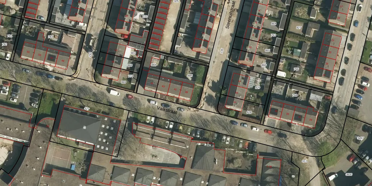 Het perceel waarop Valkstraat 39 staat heeft een oppervlakte van 557 m². Dit is een groot perceel. De perceeloppervlakte wordt geregistreerd door het Kadaster. Gedetailleerde informatie over de maten van dit perceel kunt u vinden in het rapport Kadastrale kaart met maatvoering van Valkstraat 39.