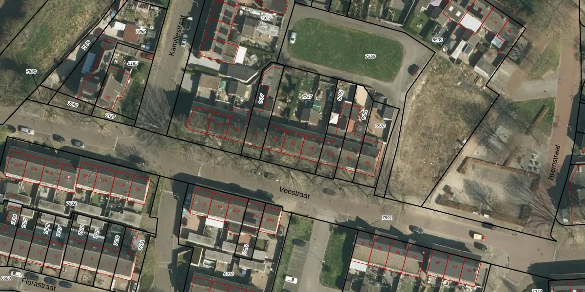 Het perceel waarop Veestraat 58 staat heeft een oppervlakte van 643 m². Dit is een groot perceel. De perceeloppervlakte wordt geregistreerd door het Kadaster. Gedetailleerde informatie over de maten van dit perceel kunt u vinden in het rapport Kadastrale kaart met maatvoering van Veestraat 58.