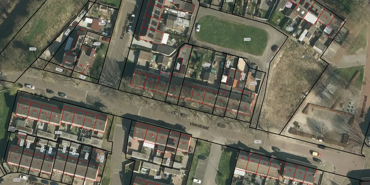 Het perceel waarop Veestraat 60 staat heeft een oppervlakte van 643 m². Dit is een groot perceel. De perceeloppervlakte wordt geregistreerd door het Kadaster. Gedetailleerde informatie over de maten van dit perceel kunt u vinden in het rapport Kadastrale kaart met maatvoering van Veestraat 60.
