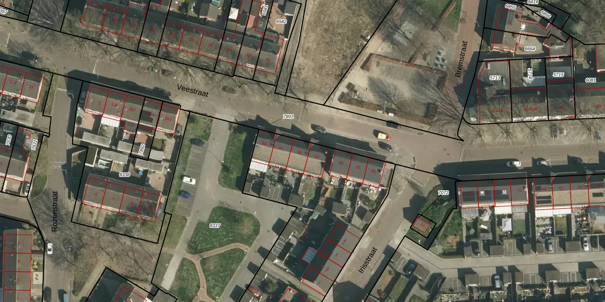 Het perceel waarop Veestraat 89 staat heeft een oppervlakte van 9093 m². Dit is een zeer groot perceel. De perceeloppervlakte wordt geregistreerd door het Kadaster. Gedetailleerde informatie over de maten van dit perceel kunt u vinden in het rapport Kadastrale kaart met maatvoering van Veestraat 89.