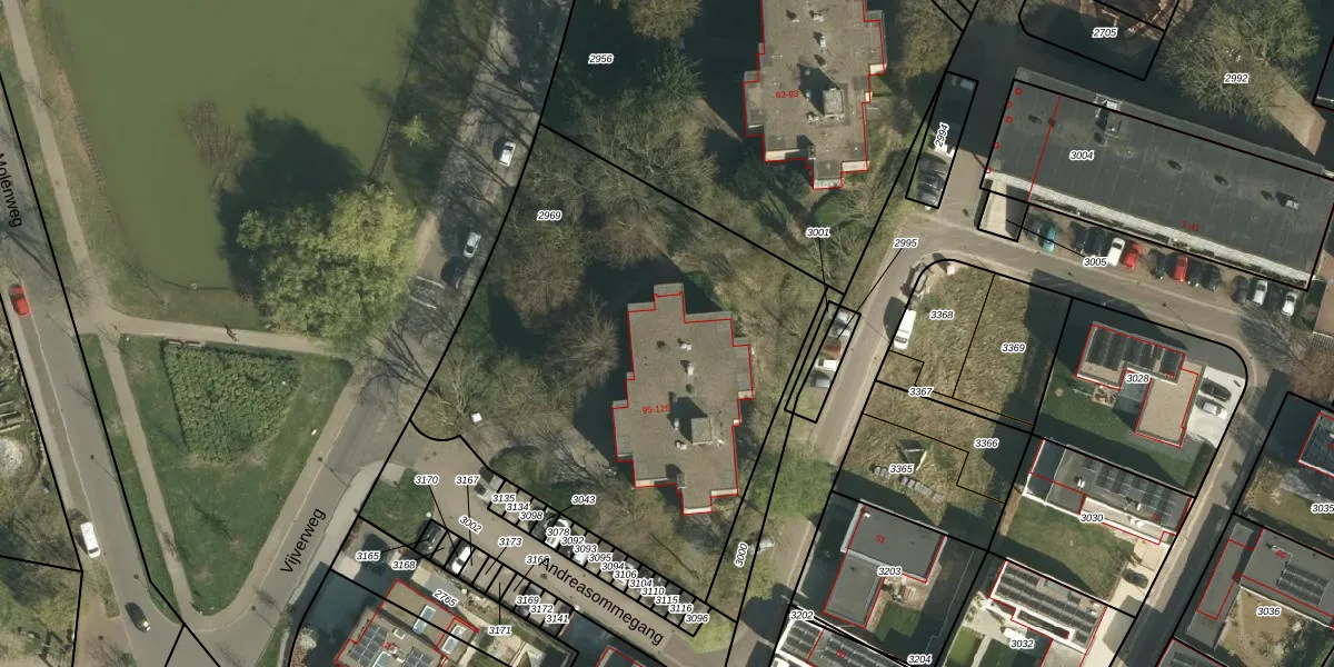 Het perceel waarop Vijverweg 115 staat heeft een oppervlakte van 2426 m². Dit is een zeer groot perceel. De perceeloppervlakte wordt geregistreerd door het Kadaster. Gedetailleerde informatie over de maten van dit perceel kunt u vinden in het rapport Kadastrale kaart met maatvoering van Vijverweg 115.