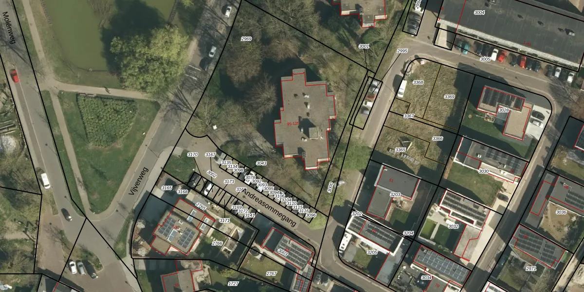 Het perceel waarop Vijverweg 125 staat heeft een oppervlakte van 2426 m². Dit is een zeer groot perceel. De perceeloppervlakte wordt geregistreerd door het Kadaster. Gedetailleerde informatie over de maten van dit perceel kunt u vinden in het rapport Kadastrale kaart met maatvoering van Vijverweg 125.