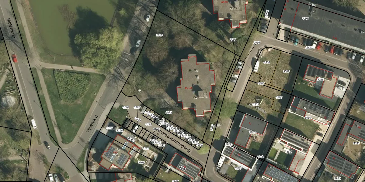 Het perceel waarop Vijverweg 95 staat heeft een oppervlakte van 2426 m². Dit is een zeer groot perceel. De perceeloppervlakte wordt geregistreerd door het Kadaster. Gedetailleerde informatie over de maten van dit perceel kunt u vinden in het rapport Kadastrale kaart met maatvoering van Vijverweg 95.