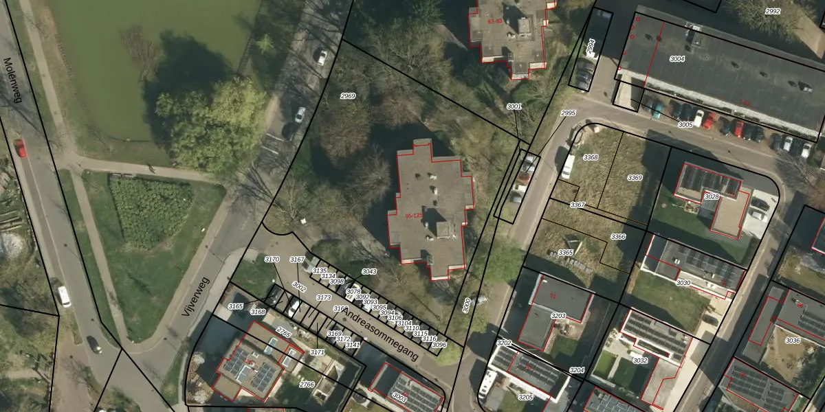Het perceel waarop Vijverweg 96 staat heeft een oppervlakte van 2426 m². Dit is een zeer groot perceel. De perceeloppervlakte wordt geregistreerd door het Kadaster. Gedetailleerde informatie over de maten van dit perceel kunt u vinden in het rapport Kadastrale kaart met maatvoering van Vijverweg 96.
