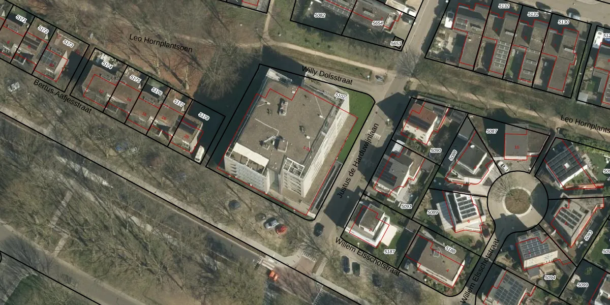 Het perceel waarop Willy Dolsstraat 21 staat heeft een oppervlakte van 1665 m². Dit is een zeer groot perceel. De perceeloppervlakte wordt geregistreerd door het Kadaster. Gedetailleerde informatie over de maten van dit perceel kunt u vinden in het rapport Kadastrale kaart met maatvoering van Willy Dolsstraat 21.