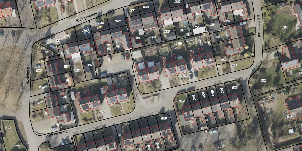 Het perceel waarop Batingestraat 18 staat heeft een oppervlakte van 1645 m². Dit is een zeer groot perceel. De perceeloppervlakte wordt geregistreerd door het Kadaster. Gedetailleerde informatie over de maten van dit perceel kunt u vinden in het rapport Kadastrale kaart met maatvoering van Batingestraat 18.