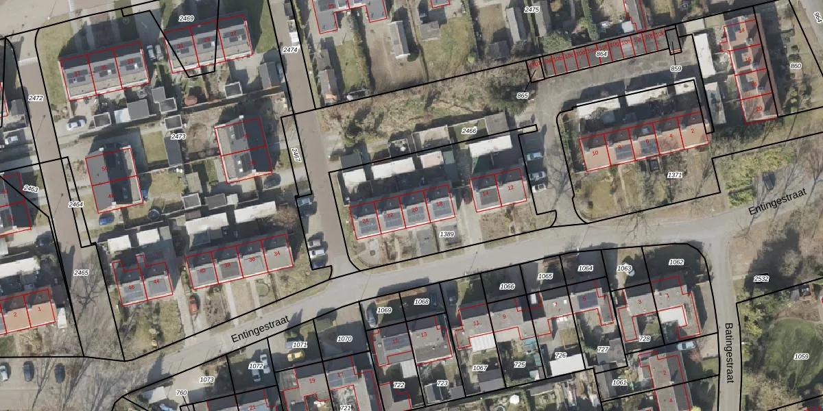 Het perceel waarop Entingestraat 20 staat heeft een oppervlakte van 1180 m². Dit is een zeer groot perceel. De perceeloppervlakte wordt geregistreerd door het Kadaster. Gedetailleerde informatie over de maten van dit perceel kunt u vinden in het rapport Kadastrale kaart met maatvoering van Entingestraat 20.
