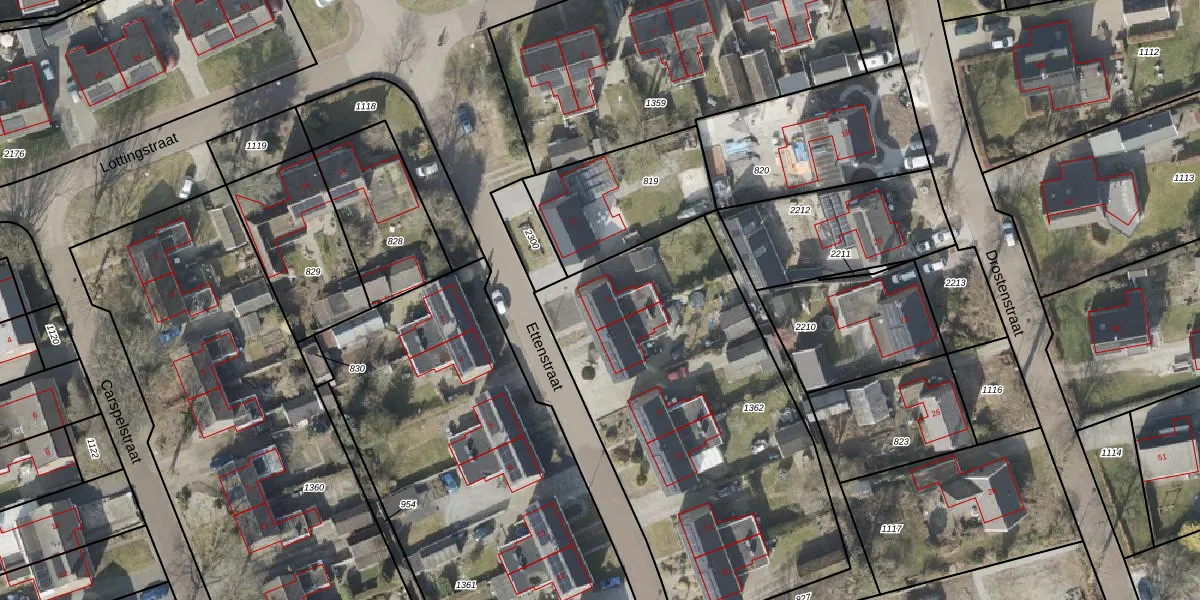 Het perceel waarop Ettenstraat 5 staat heeft een oppervlakte van 1990 m². Dit is een zeer groot perceel. De perceeloppervlakte wordt geregistreerd door het Kadaster. Gedetailleerde informatie over de maten van dit perceel kunt u vinden in het rapport Kadastrale kaart met maatvoering van Ettenstraat 5.