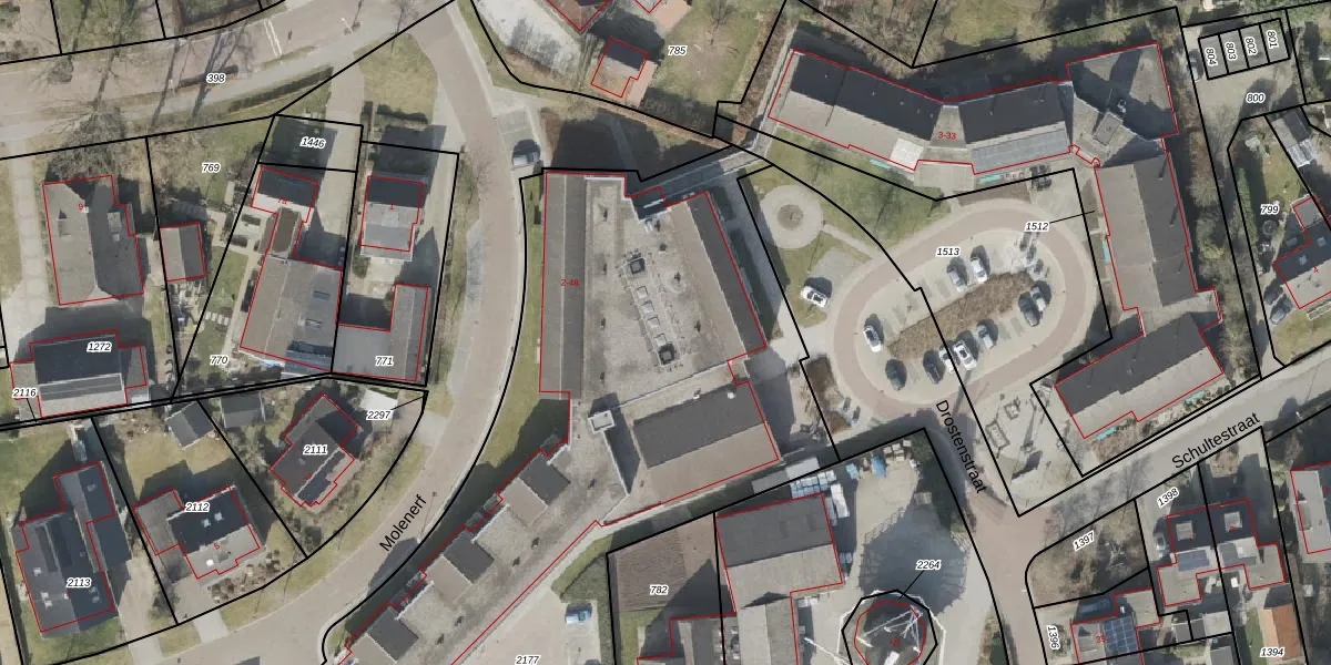 Het perceel waarop Molenerf 38 staat heeft een oppervlakte van 3565 m². Dit is een zeer groot perceel. De perceeloppervlakte wordt geregistreerd door het Kadaster. Gedetailleerde informatie over de maten van dit perceel kunt u vinden in het rapport Kadastrale kaart met maatvoering van Molenerf 38.
