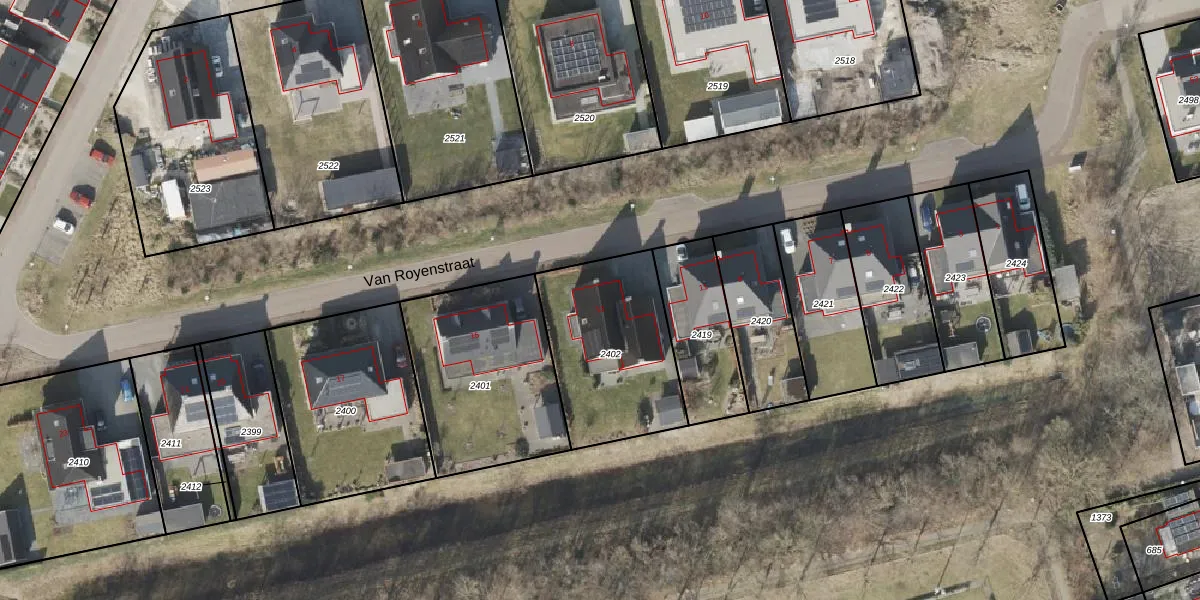 Van Royenstraat 13 is gelegen op kadastraal perceel SLE00R2402. Deze kadastrale aanduiding is uniek en wordt gebruikt door het Kadaster om eigendomsrechten en andere zakelijke rechten vast te leggen. Het perceel maakt onderdeel uit van de kadastrale gemeente Sleen.