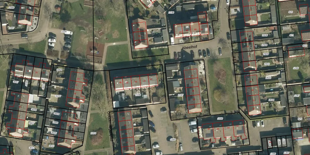 Het perceel waarop Abeelhof 42 staat heeft een oppervlakte van 843 m². Dit is een groot perceel. De perceeloppervlakte wordt geregistreerd door het Kadaster. Gedetailleerde informatie over de maten van dit perceel kunt u vinden in het rapport Kadastrale kaart met maatvoering van Abeelhof 42.
