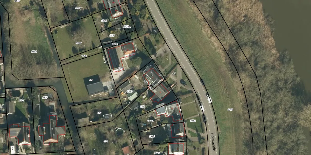 Hoekeinde 7 is gelegen op kadastraal perceel WKD00S1320. Deze kadastrale aanduiding is uniek en wordt gebruikt door het Kadaster om eigendomsrechten en andere zakelijke rechten vast te leggen. Het perceel maakt onderdeel uit van de kadastrale gemeente Werkendam.