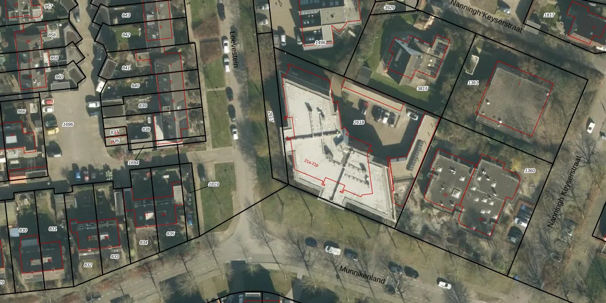 Het perceel waarop Munnikenland 21-a staat heeft een oppervlakte van 1955 m². Dit is een zeer groot perceel. De perceeloppervlakte wordt geregistreerd door het Kadaster. Gedetailleerde informatie over de maten van dit perceel kunt u vinden in het rapport Kadastrale kaart met maatvoering van Munnikenland 21-a.