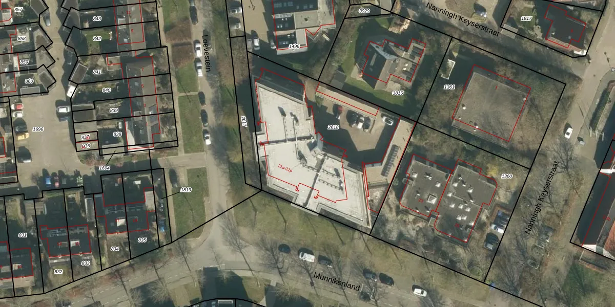 Het perceel waarop Munnikenland 21-e staat heeft een oppervlakte van 1955 m². Dit is een zeer groot perceel. De perceeloppervlakte wordt geregistreerd door het Kadaster. Gedetailleerde informatie over de maten van dit perceel kunt u vinden in het rapport Kadastrale kaart met maatvoering van Munnikenland 21-e.
