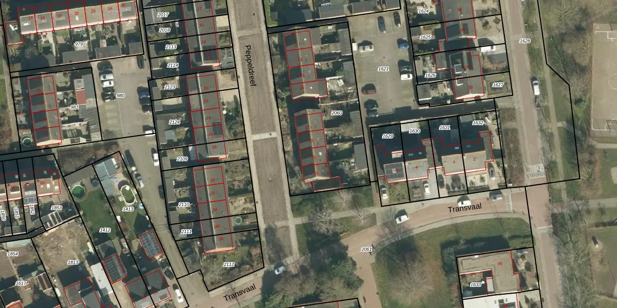 Het perceel waarop Peppeldreef 21 staat heeft een oppervlakte van 1396 m². Dit is een zeer groot perceel. De perceeloppervlakte wordt geregistreerd door het Kadaster. Gedetailleerde informatie over de maten van dit perceel kunt u vinden in het rapport Kadastrale kaart met maatvoering van Peppeldreef 21.