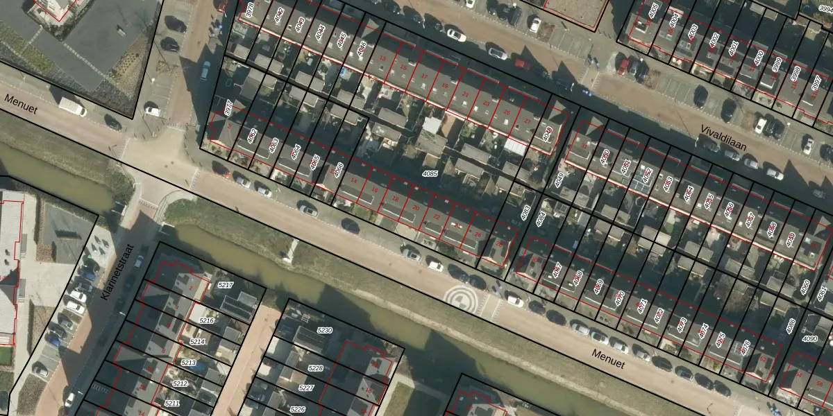 Het perceel waarop Menuet 20 staat heeft een oppervlakte van 1862 m². Dit is een zeer groot perceel. De perceeloppervlakte wordt geregistreerd door het Kadaster. Gedetailleerde informatie over de maten van dit perceel kunt u vinden in het rapport Kadastrale kaart met maatvoering van Menuet 20.