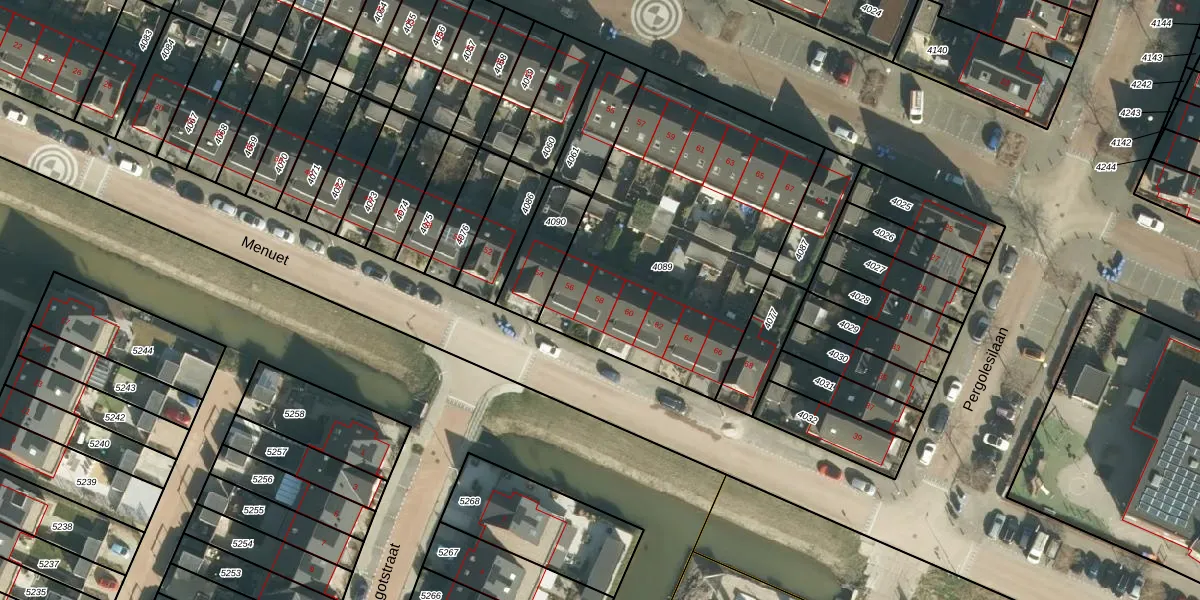 Het perceel waarop Menuet 58 staat heeft een oppervlakte van 1597 m². Dit is een zeer groot perceel. De perceeloppervlakte wordt geregistreerd door het Kadaster. Gedetailleerde informatie over de maten van dit perceel kunt u vinden in het rapport Kadastrale kaart met maatvoering van Menuet 58.