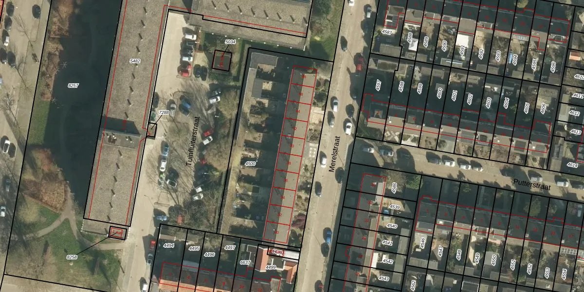 Het perceel waarop Merelstraat 40 staat heeft een oppervlakte van 1880 m². Dit is een zeer groot perceel. De perceeloppervlakte wordt geregistreerd door het Kadaster. Gedetailleerde informatie over de maten van dit perceel kunt u vinden in het rapport Kadastrale kaart met maatvoering van Merelstraat 40.