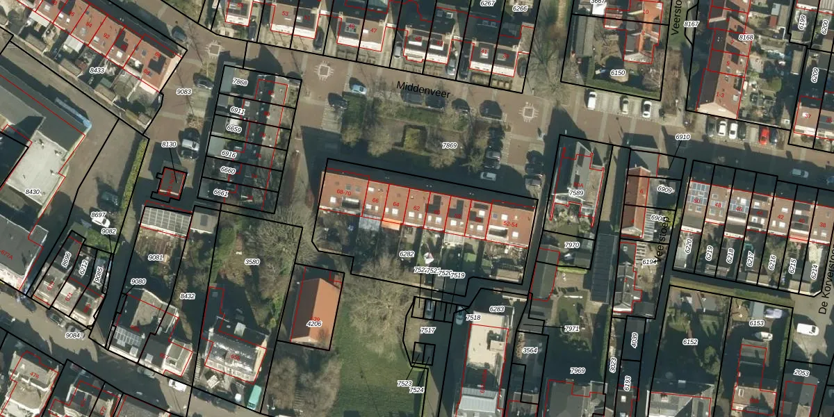 Het perceel waarop Middenveer 62 staat heeft een oppervlakte van 1223 m². Dit is een zeer groot perceel. De perceeloppervlakte wordt geregistreerd door het Kadaster. Gedetailleerde informatie over de maten van dit perceel kunt u vinden in het rapport Kadastrale kaart met maatvoering van Middenveer 62.