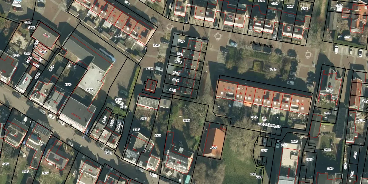 Het perceel waarop Middenveer 72 staat heeft een oppervlakte van 98 m². Dit is een klein perceel. De perceeloppervlakte wordt geregistreerd door het Kadaster. Gedetailleerde informatie over de maten van dit perceel kunt u vinden in het rapport Kadastrale kaart met maatvoering van Middenveer 72.