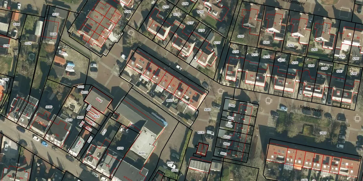 Het perceel waarop Middenveer 90 staat heeft een oppervlakte van 1007 m². Dit is een zeer groot perceel. De perceeloppervlakte wordt geregistreerd door het Kadaster. Gedetailleerde informatie over de maten van dit perceel kunt u vinden in het rapport Kadastrale kaart met maatvoering van Middenveer 90.