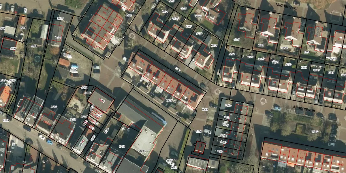 Het perceel waarop Middenveer 92 staat heeft een oppervlakte van 1007 m². Dit is een zeer groot perceel. De perceeloppervlakte wordt geregistreerd door het Kadaster. Gedetailleerde informatie over de maten van dit perceel kunt u vinden in het rapport Kadastrale kaart met maatvoering van Middenveer 92.