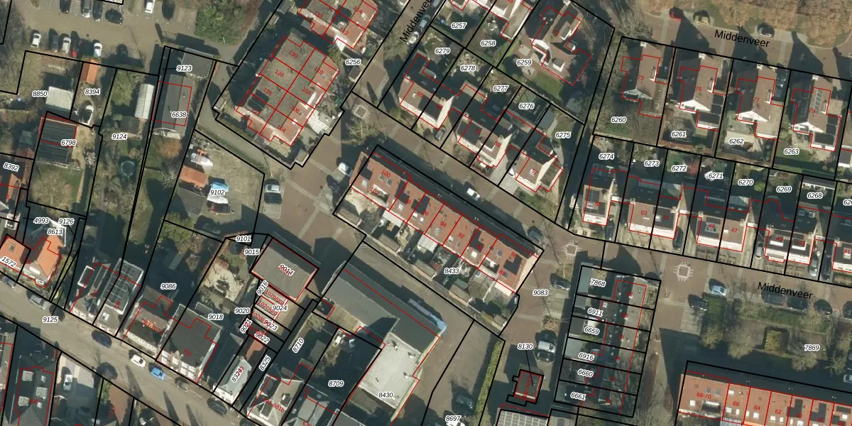 Het perceel waarop Middenveer 96 staat heeft een oppervlakte van 1007 m². Dit is een zeer groot perceel. De perceeloppervlakte wordt geregistreerd door het Kadaster. Gedetailleerde informatie over de maten van dit perceel kunt u vinden in het rapport Kadastrale kaart met maatvoering van Middenveer 96.