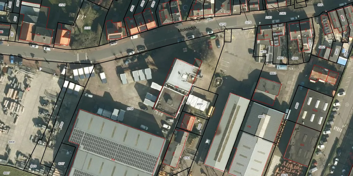 Het perceel waarop Molendijk 166 staat heeft een oppervlakte van 5257 m². Dit is een zeer groot perceel. De perceeloppervlakte wordt geregistreerd door het Kadaster. Gedetailleerde informatie over de maten van dit perceel kunt u vinden in het rapport Kadastrale kaart met maatvoering van Molendijk 166.